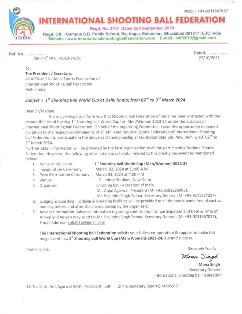 - 1st (Men/Women) Shooting Ball World Cup held at J.L.N. Stadium, New Delhi from 02nd to 03rd March 2024