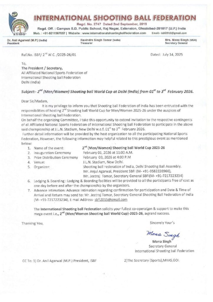 - 2nd (Men/Women) Shooting Ball World Cup will be held at J.L.N. Stadium, New Delhi from 01st to 3rd February 2026.